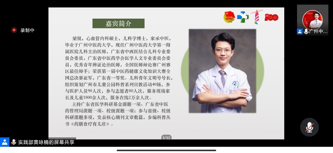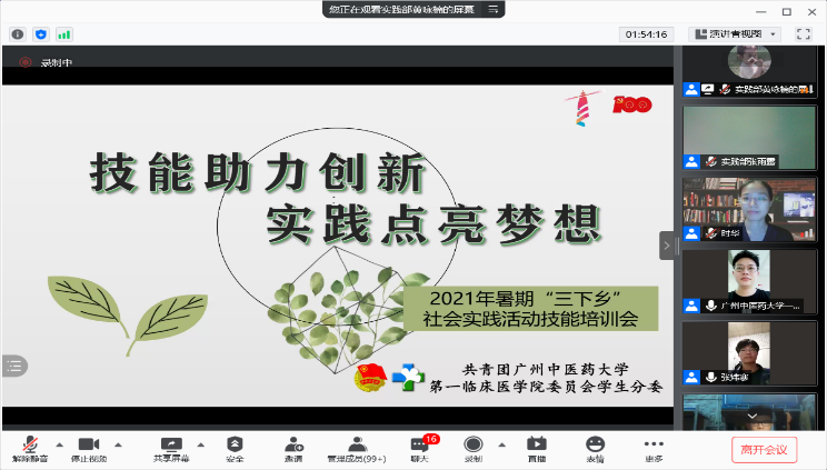 【一院讯】2021年6月18日晚,伟德国际1946源于英国“技能助力创新,实践点亮梦想”2021年暑期三下乡社会实践活动技能培训会在腾讯会议平台如期举行。我校公共卫生与管理学院应用心理学系主任、中医心理学博士生导师黄时华教授、我校第一附属医院儿科主治医师梁锐博士、一院学生分团委书记池思晓老师、以及一院240名三下乡队伍代表参加了本次线上培训会。本次培训会旨在通过对三下乡调研报告的选题、研究设计及报告撰写等方面进行培训,为我院学子顺利开展暑期三下乡社会调研活动奠定良好的基础。