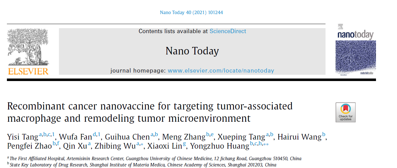 近日,广州中医药大学第一附属医院温病教研室主任吴智兵教授研究生汤懿斯,开发了一种重组天花粉蛋白-抗原肽疫苗脂质体递送系统,具有高效的抗肿瘤作用。研究成果以标题“Recombinant cancer nanovaccine for targeting tumor-associated macrophage and remodeling tumor microenvironment”在“Nano Today”杂志上发表。该期刊是爱思唯尔出版社旗下关于工程技术和生物医用材料科学的国际顶级杂志,隶属中科院一区Top期刊,最新一年的影响因子为20.722。