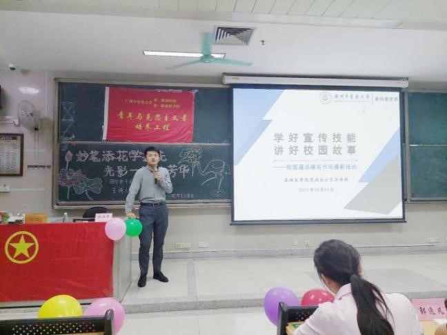 正式授课前,洪老师结合自身经历提出:“学好一项技能并不难,哪怕你是零基础,只要你有心,你也照样可以把这件事情做好。”课上,洪老师结合自己多年撰写通讯稿的经验,从通讯稿格式及分类、内容要求及其要点等方面进行讲解,以各大主流媒体、我校、我院官网的通讯稿为例,生动具体地引导我们剖析高质量通讯稿所应具备的要点。同时,洪老师针对通讯稿中常见的问题进行分析,开出了相应的“处方”。他强调:“真正把一篇通讯稿做到极致的意义是伟大的。”这需要精益求精、一丝不苟的精神,也需要青马学员们不断学习,不断提升自己的文书写作能力。随后,洪老师结合自己曾作为团学骨干的工作经验,为青马学员带来有关校园摄影活动内容、角度的讲解。他以本次讲座为例,与现场摄影的工作人员进行互动教学,为青马学员们生动地阐述了校园摄影的相关实用技巧。他表示,优秀的摄影也是一种用心的表达。