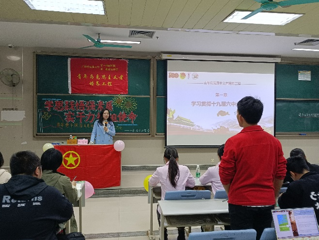 本次培训主要分为四个部分的内容。首先,池老师带领青马学员一起学习中国共产党十九届六中全会精神。池老师通过视频观看、知识要点讲授的方式深入浅出地为青马学员介绍了中国共产党十九届六中全会的主要内容,使同学们了解了在建党百年之际召开本次大会的重要意义,也加深了同学们对我党百年奋斗中的第三个“历史决议”——《中共中央关于党的百年奋斗重大成就和历史经验的决议》的精神实质和重大意义的理解。她还通过有奖竞答的方式现场考察同学们对全会相关知识的掌握情况,并勉励学员们鉴往知来,把我党发展的宝贵经验应用到日常的生活、学习、工作的实践中去。