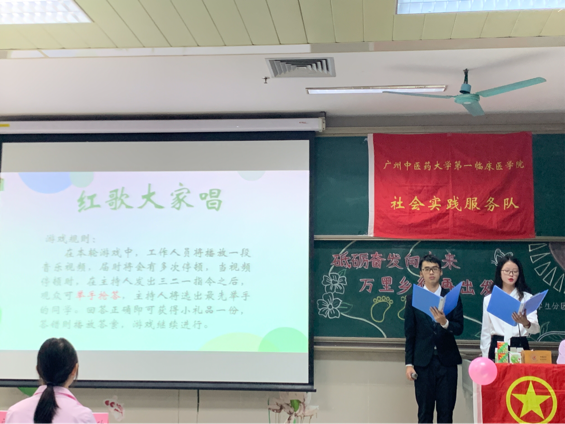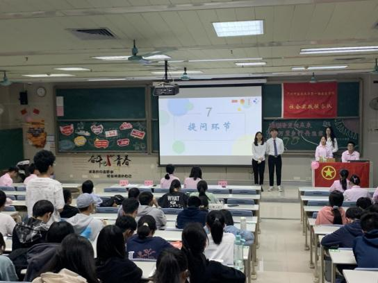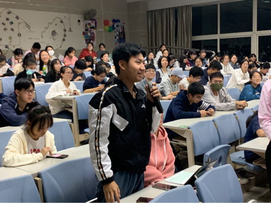 会议开始前,现场播放了2021年我院“三下乡”队伍回顾视频,向同学们充分展现了我院2021年暑期社会实践活动的风采。接着,会议正式开始。我院广东省“益苗计划”获奖队伍"福铃"队代表陈彬奇上台发言。福铃队作为一支有十一年社会实践服务经验的队伍,其在队员招募、活动设计、团队管理等方面形成的经验为有意向参与三下乡的同学们提供了有效的借鉴。紧接着,我院省级重点社会实践团队"岐黄成蹊"队队伍代表胡国涛为我们分享了标书撰写经验和队伍组建注意事项。两位队伍代表的精彩分享带领同学们走进“三下乡”,极大提高了同学们对社会实践活动的兴趣和热情。本次活动还设置了游戏互动环节,包括“红歌大家唱”和“记忆九宫格”。同学们积极参与游戏,现场气氛十分热烈。随后,活动进入宣讲环节,一院学生分团委实践部负责人黄羽欣对我院暑期社会实践系列活动的总体流程、相关要求和活动准备等方面进行宣讲,带领同学们更深入地了解暑期社会实践系列活动。听完分享与宣讲后,尚存困惑的观众就资金支持与下乡选址要素等方面提出问题,两位队伍代表与实践部负责人均对提问进行了耐心地解答,消除了同学们的疑虑,并鼓励同学们勇于迈出实践的步伐。最后,嘉宾与观众合影留念,至此,本次宣讲会圆满结束。