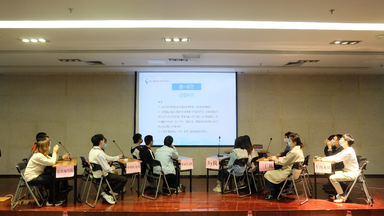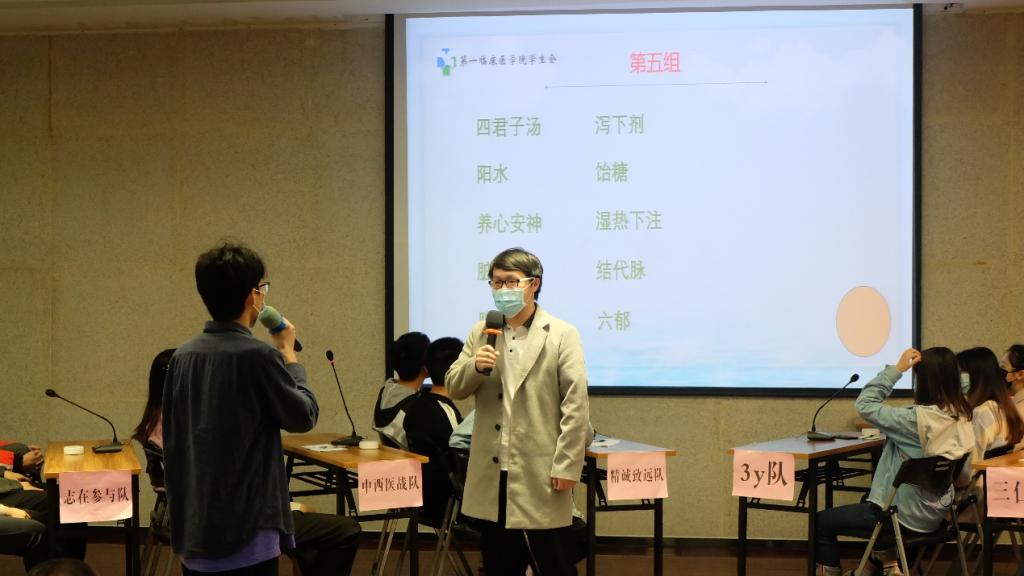 活动第一部分为方剂竞赛,经过先前的激烈角逐共有六支队伍脱颖而出,分别是志在参与队、中西医战队、精诚致远队、3y队、三仁队、牛肉丸队。本次竞赛设有必答、抢答、你说我猜、挑战题共四个环节。比赛过程精彩激烈,各支队伍都凭借良好扎实的基础在场上“斗智斗勇”,掀起一浪盖一浪的高潮。在场观众对选手们熟读方剂的表现惊叹连连,场下掌声不断。最终精诚致远队凭靠优异表现获得最高分,在本次方剂大赛中一举夺魁。