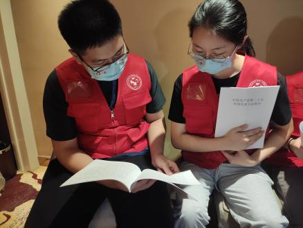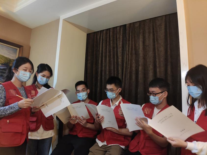 在派出执行任务期间,大学和学院领导高度重视,多方给予慰问和关心。学院学生团委书记池思晓、辅导员彭力阳,组织骨干及时为志愿者们送去生活用品、防护物资,还有精神食粮——为每位同学准备了《中国共产党第二十次全国代表大会报告》(文字实录)打印文本供学习。