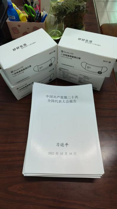 (学院为志愿者们送上防疫物资和党的二十大报告文字实录打印稿)