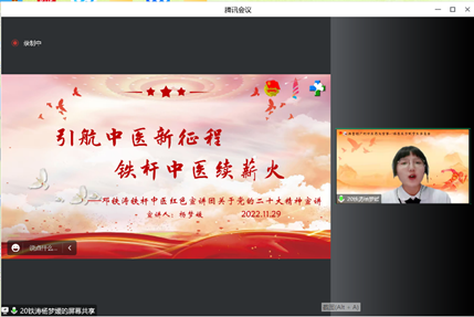会议第三部分,我院邓铁涛铁杆中医红色宣讲团团长杨梦媛同学以“引航中医新征程,铁杆中医续薪火”为主题,从党的二十大报告中关于中医药发展的内容出发,分享了我院国医大师邓铁涛教授一生不遗余力传承、创新、发展中医药事业的故事。最后,她号召与会青马学员,作为杏林学子当赓续铁涛薪火,继承邓老铁杆中医红色精神,在未来的新征程里与国家同频,与时代共振。