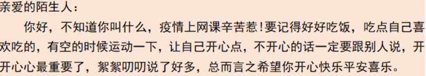 本次线上主题宿舍活动包含三个各具特色的小活动,分别是“温情问候暖心田”一次来自陌生人的温暖问候活动、“一见钟‘寝’”宿舍创意集体照/视频制作活动和“生活小确幸”日记打卡活动。在我院学子的积极参与下,活动顺利开展并取得了良好的效果。言轻而意重,陌生却温暖,同学们用温暖的文字表达对陌生人的美好祝福,感受这世间莫大的善意;感知小美好,享受小满足,同学们用日记记录在疫情封校生活中的点滴,倾听生活的心声;多彩生活,搞怪创意,同学们用照片或者视频定格属于他们的美好瞬间,愿往后依旧不负韶华,一往无前。