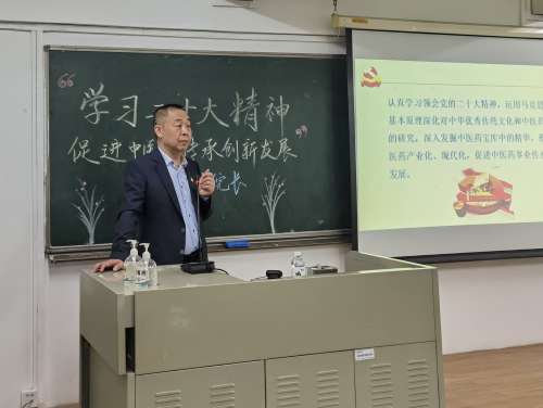 关彤副院长主要分三个部分进行授课。首先是讲授开辟马克思主义中国化时代化新境界。马克思主义是我们立党立国、兴党兴国之本,中医药文化要传承和发展,就必须同马克思主义紧密结合。其次,马克思主义基本原理同中华优秀传统文化相结合的历史基础。马克思主义的基本原理作为世界优秀的文化思想,揭示了人类社会发展规律,指明了人类解放的道路,推进了人类文明进步。而中华文化在几千年的发展过程中,不断吸纳外来文化,实现自我更新。马克思主义与中华优秀传统文化中的辩证思想、整体思维、和合思想、大同理想等是不谋而合的。最后,用马克思主义基本原理推动中医药传承创新发展。关彤副院长指出,要坚定文化自信,认识到中医药的独特价值和先进性,既要加强与外来文化的沟通,又要保持民族特色。以马克思主义作为方法论,逐渐扩大中医药文化的影响力,使中医药文化在更深层次上走向世界,造福人类。