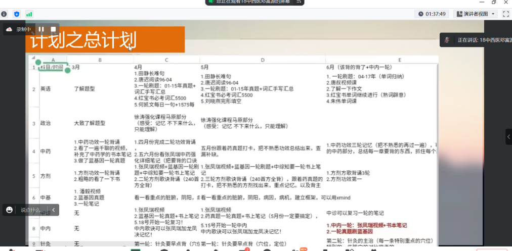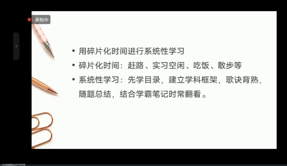 录取于广中医针康学院的邓富源师兄首先给我们明确考研的初心,回答为什么要考研以及如何考研等问题,并详细讲解了自己备考过程中制定的总计划、月计划、周计划和日计划,表示每天都要安排时间计划学习,同时强调注意休息,劳逸结合,还分享了三大科目的复习重点和方法,最后师兄也鼓励同学们要有信心,保持好心态和毅力,坚持到底!