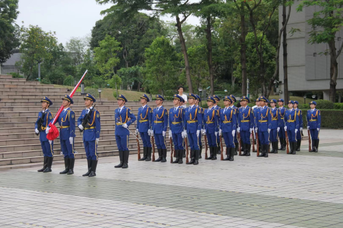 “齐步走——”升旗仪式正式开始,在全场肃静中,国旗护卫队的护旗手们衣装笔挺,步履铿锵,坚定地护卫国旗入场。虽然天空不作美,下起了大雨,却压不弯国旗护卫队队员们挺拔的身姿。