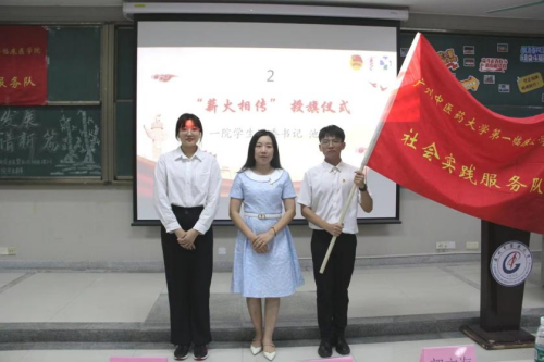 一院学生团委书记池思晓与队伍代表赵艺涵、林梓烨进行旗帜交接仪式